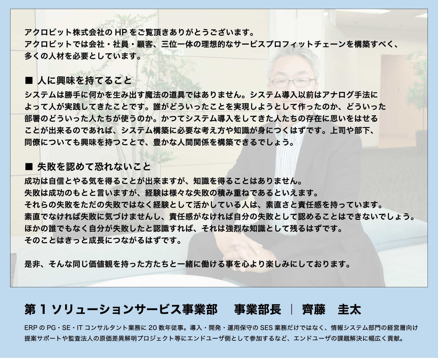 アクロビットでは創業当初よりITスキル研修とは別に『プレゼンテーション(思いを伝える)』や『マネージメント(聞く、聴く、訊く)』集合研修を、私を含め全社員が仕事として受講しています。さらに学んだ事はそのままにせず、社員同士で練習を繰り返して所作として身につけるようにしています。